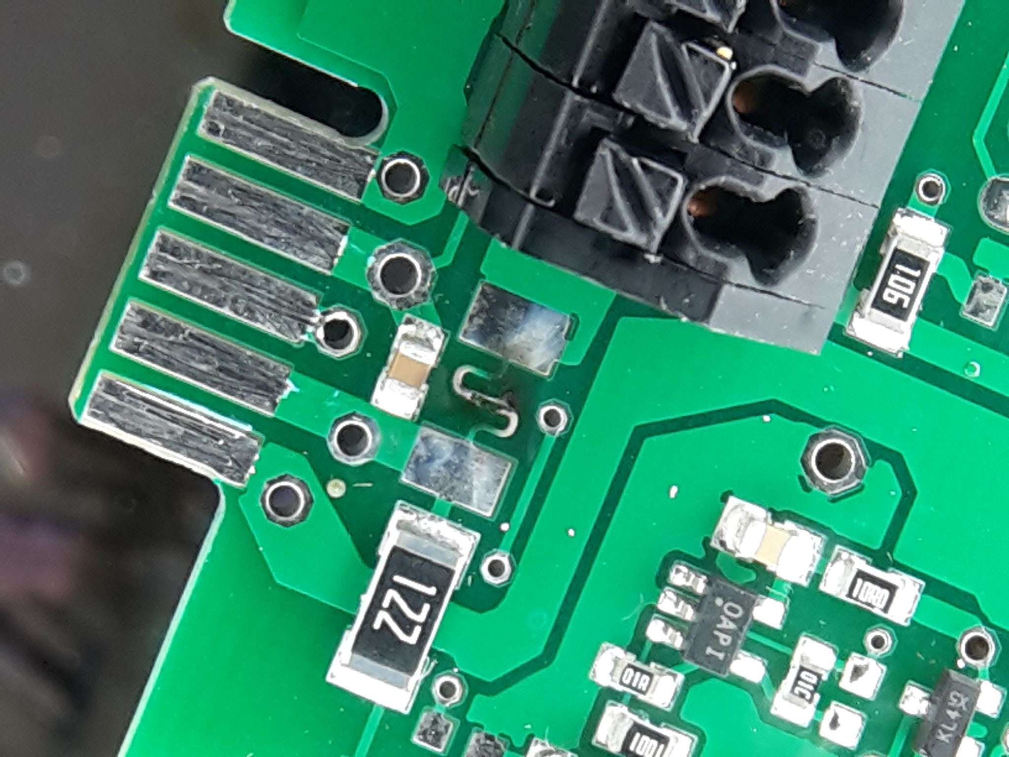The trace actually looked like its single purpose would be to function as a safety fuse. As a result I soldered a thin wire between the pads as replacement fuse: